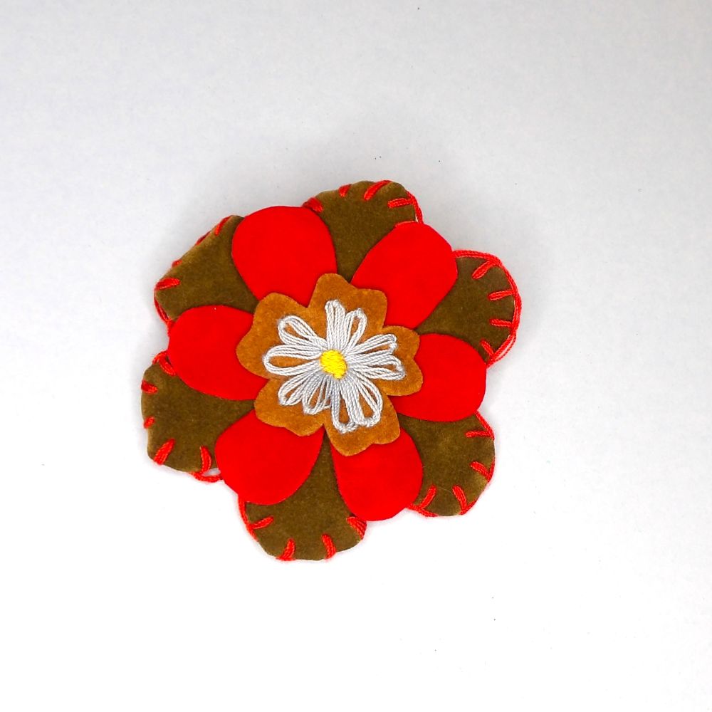 Flower Brooch With Stitched Edge Fabric Design Moss Green With Red size 80mm clearance